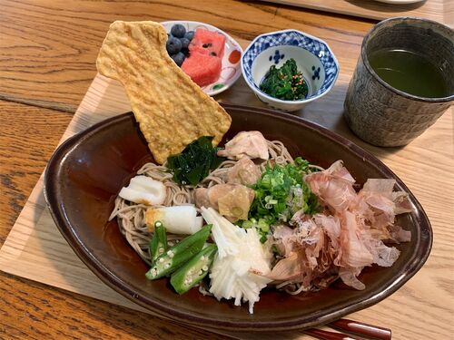 お昼はどうも麺類が食べたくなるのは夏のせい? 週に2-3回麺類を食しております。 冷蔵庫にあるものをぶっかければ、それで十分美味しいのでした。 いつもの卯月製麺のほっそり細そばに、竹輪を三等分し、残ってた山芋は千切りに、鶏肉は塩して、オクラと共…