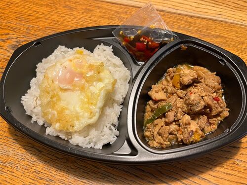 ガパオライス 夕方、タイのガパオのお弁当680円が半値の340円に値下げになっていたので、ひとり夕飯用に買って来ました タイ人のコックさんが作っているだけあって、鶏肉がザクザクカットされていて、本格的です! コクがあっておいしかったー モチモチ食感…
