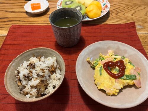 お昼に、舞茸おこわを作りました。 餅米が残っていたので、餅米と新米合わせて4合に白だしを加えて炊いて、 水で戻した乾燥舞茸と生舞茸を刻んで、サラダ油で炒めて塩で調味して、炊き上がったご飯に加えました。 檜枝岐村の、民宿尾瀬野の奥さんに教えても…