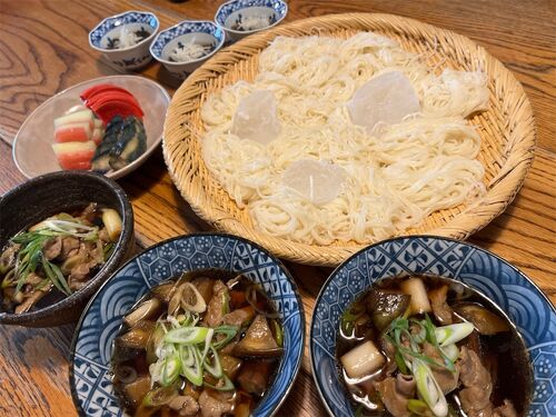 ギャル曽根のそうめんつけ汁 この季節新たなるそうめんの味を求めて、ギャル曽根のそうめんつけ汁を作ってみた。 <材料>2-3人分 ・なす:2個 ・豚バラ薄切り肉:1パック ・ネギ:2本 ・ごま油:適量 ・めんつゆ(2倍濃縮):200cc ・水:450cc ・そうめん…