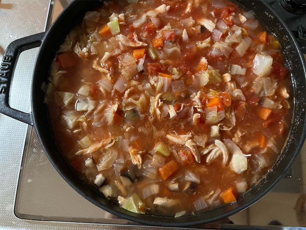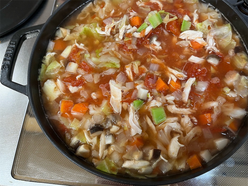ささみを10分茹でてしばし放し、ささみは取り出して、他の野菜を加えて煮る。